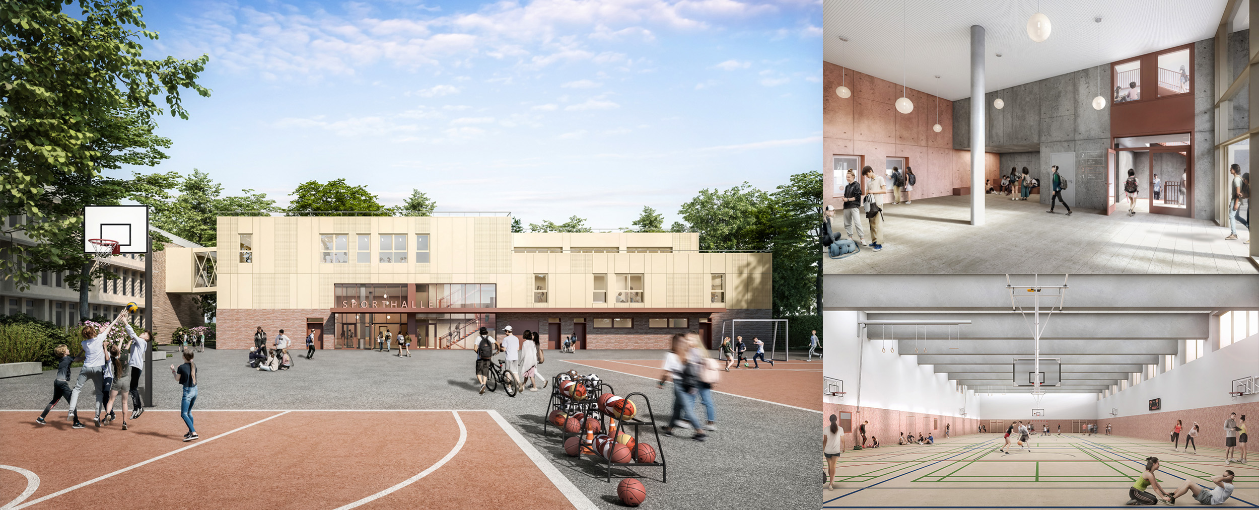 Mit dem Partner Depenbrock gewinnen abj Architektinnen aus Hamburg den Wettbewerb in Köln. Das Motto des Entwurfes lautet »Sport auf allen Niveaus«. Der Erweiterungsneubau sieht drei Sporthallenfelder in gestapelter Ausführung inkl. Nebenflächen sowie ein Klassentrakt mit vier Klassenräumen vor. Er gliedert sich wie selbstverständlich in den Bestand ein und verbindet die inneren Nutzungsusammenhänge effizient und logisch.