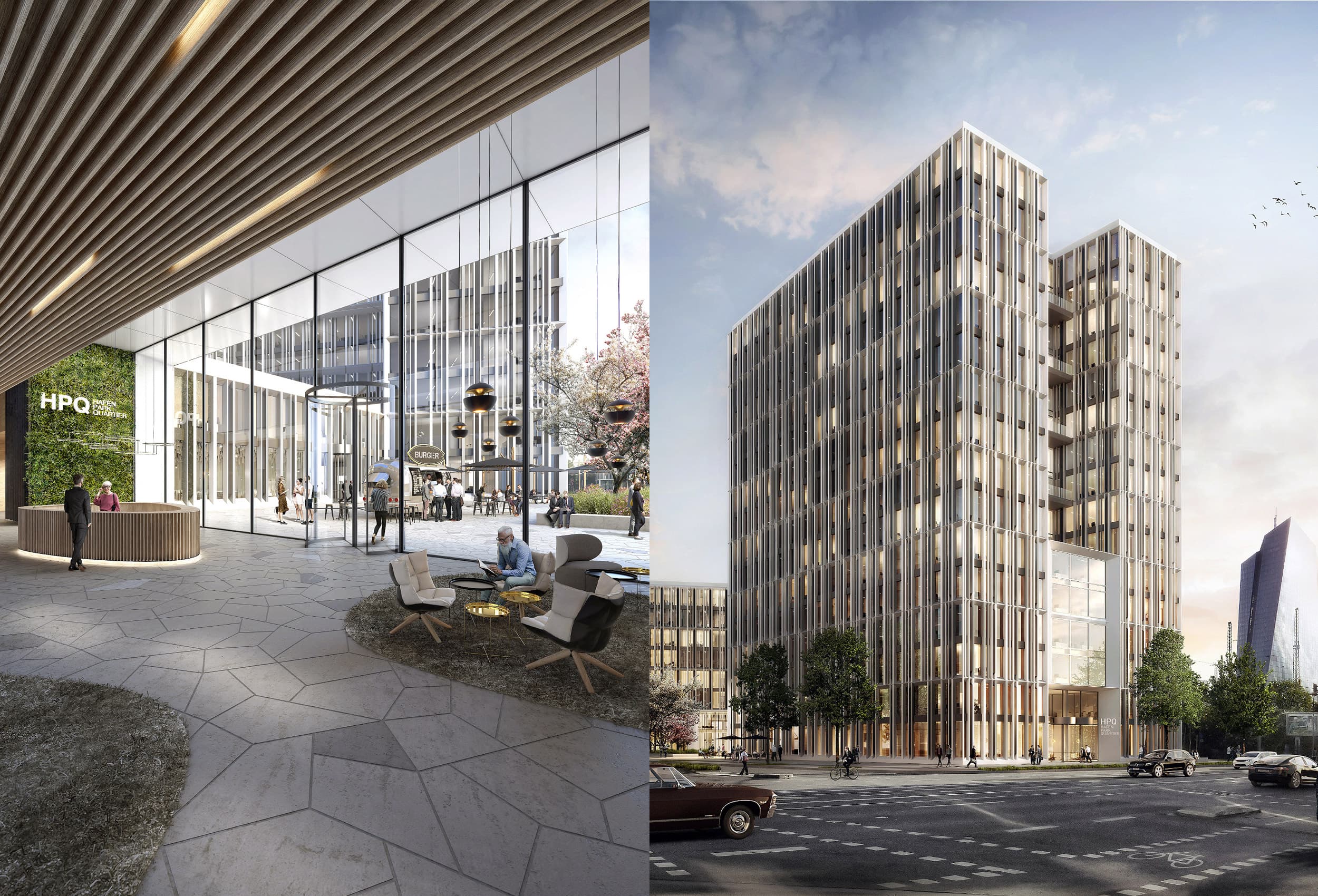 Das Ensemble aus 17-geschossigem Hochhaus mit Büronutzung und Sockelbebeauung als Eingang zum neuen Hafenpark Quartier Frankfurt bietet eine attraktive Lage für neue Unternehmen. Holger Meyer Architektur HMA belegt einen von zwei dritten Plätzen.